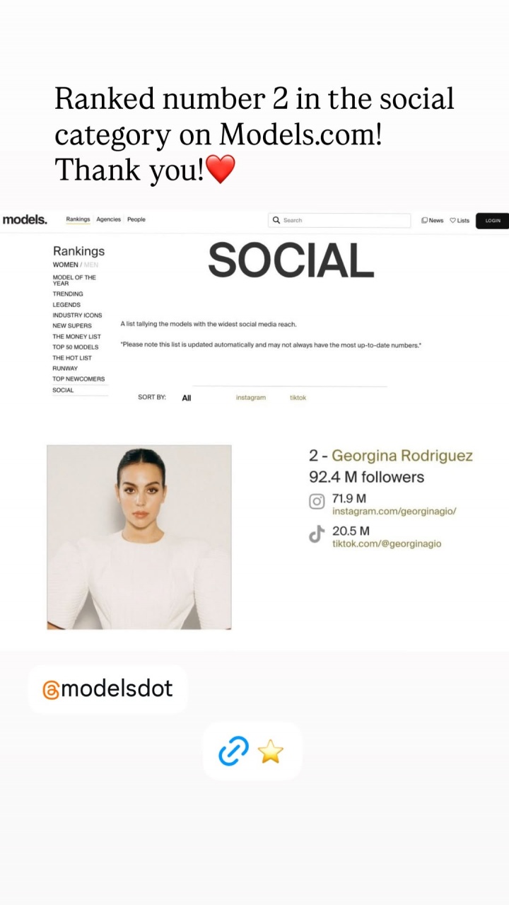 1月15日讯 乔治娜昨日更新社媒,她晒出了自己的粉丝数据排名,她在models.com网站上social分类排名第二。