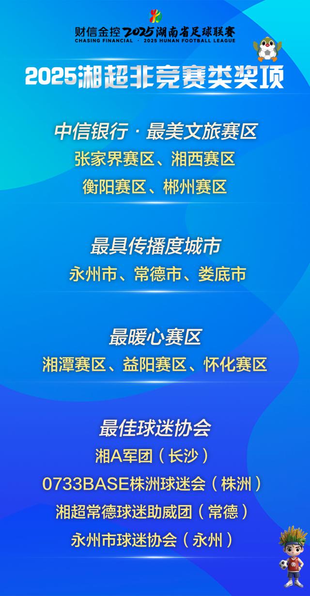 体坛周报全媒体原创 12月27日,2025湖南省足球联赛决赛,永州队对阵常德队,最终凭借着谷文杰的进球,永州队1比0取胜常德队,获得最终的冠军。 赛事结束后,本赛季奖项也随之出炉: 一、竞赛类奖项(集体荣誉奖) (一)公平竞赛奖 长沙队、株洲队、岳阳队、张家界队 (二)优秀赛区奖 长沙赛区、株洲赛区、岳阳赛区、邵阳赛区 二、竞赛类奖项(个...