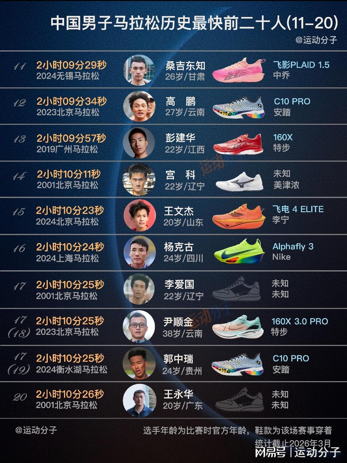 中国男子马拉松历史前20快成绩,来自9位运动员。